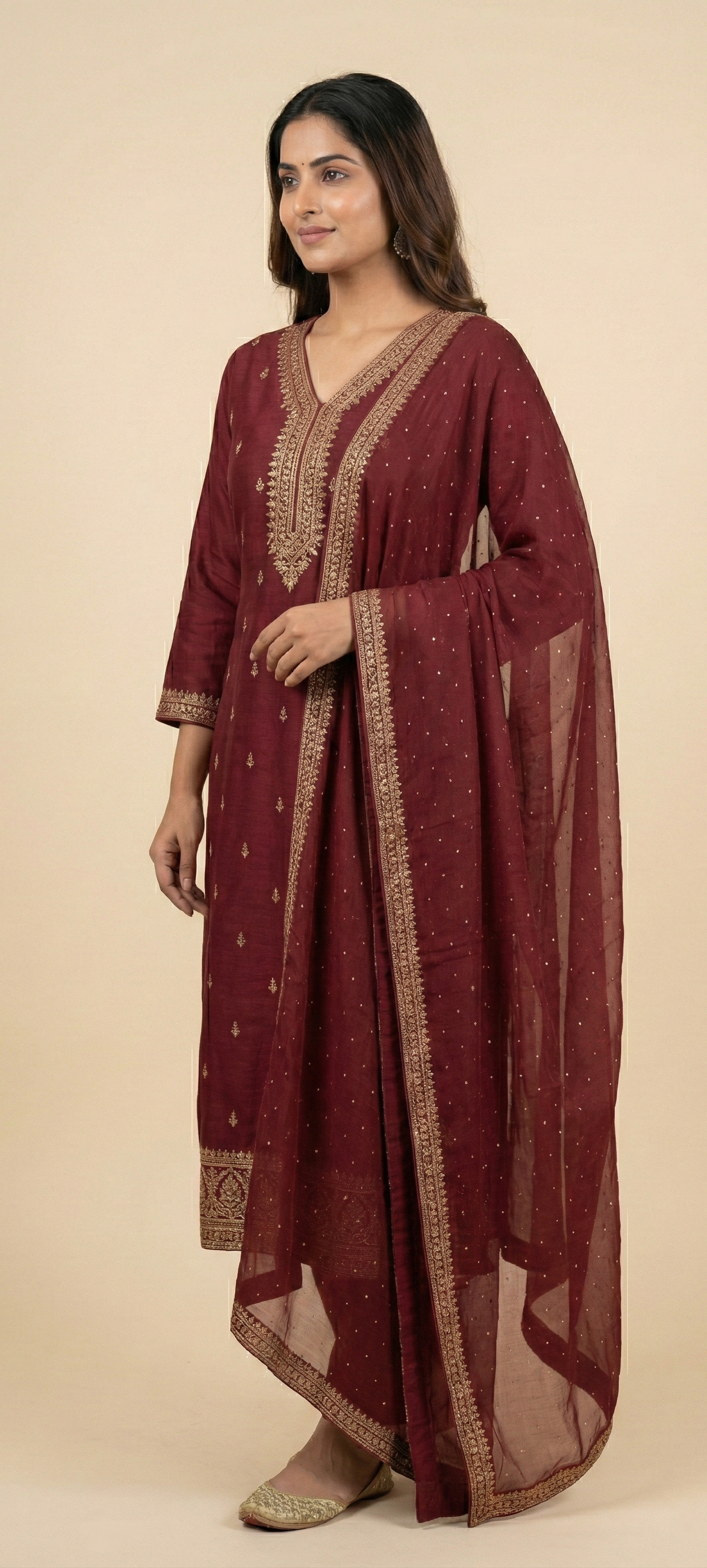 The Crimson Velvet Heritage Set reimagines classic Indian silhouettes with a modern sensibility. Crafted in rich velvet with delicate gold embroidery along the cuffs and borders, this kurta and dupatta set is designed for both occasion wear and everyday elegance.